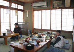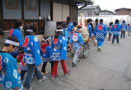 早上七時半起床,八時半吃傳統日式早餐,旅館主人問我們吃不吃生雞蛋,我們說不吃,他便把雞蛋煎熟。在房間收拾細軟時,聽到外面傳來熱鬧的聲音,於是出外看看,原來是由小朋友及家長組成的祭典巡遊隊伍正經過。