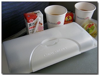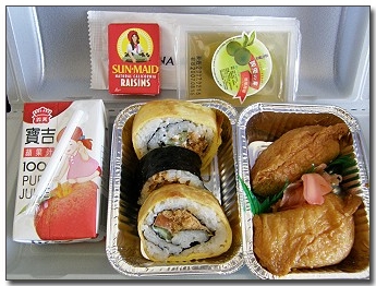 |  航機早上八時半起飛,經濟客艙約八成滿,航餐是味道普通的台式壽司,還好有別緻的餐盒盛著。 |