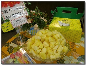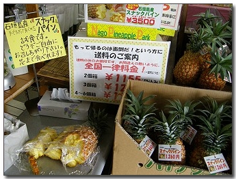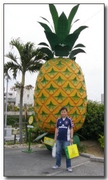 |  有了上次的駕駛經驗,很快地就在導航器裡輸入了第一個目的地─那霸菠蘿(鳳梨)園。原先只是數分鐘車程,但是因未熟習導航器的指示,加上此導航器反應較慢,需要時間讀入資料,以致多番行錯路下才到達。那霸菠蘿園是一所主要售賣波蘿食品的商店,更提供菠蘿任吃,以租車公司優惠券獲送原個菠蘿和雪葩。因為是旅程的首站,所以只買了少量手信,在門外的大菠蘿及對面的陸上自衛隊門前拍照後,驅車往午餐的地方。
