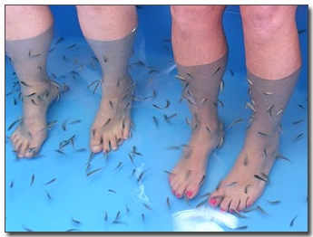 |  沖繩原來也有天然溫泉,不用付錢的當然不會錯過,以住宿附送的入場券進場更免費借出浴巾。我倆最感興趣是醫生魚溫泉,即是把雙腳放進水池內,讓生長於西亞淡水地區的醫生魚,吸吮皮膚上的老化角質及細菌,達致美膚效果。當把雙腳放進水內,數十條小魚便一擁而上圍著啄食雙腳,只感到痕癢非常,難得的體驗。 |