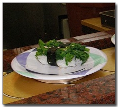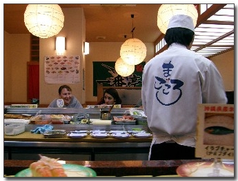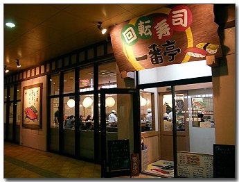 |  回房間更衣後出門逛街,北谷美濱美國村一帶有很多店鋪及特賣店,我倆先在一遊樂中心夾公仔(抓娃娃),可是花了千多Yen全無收穫。晚餐於迴轉壽司一番亭,店內有很多外國遊客惠顧,可能是此店提供不少熟吃款式的壽司,看見鄰座的黑皮膚旅客一口氣點了三碟火炙鮭魚壽司,吃得津津有味。最後我倆只吃了七碟壽司與一碗蟹味噌湯(共1,617Yen),臨走時看見菜心壽司在迴轉帶上,想不到菜心也可做壽司。