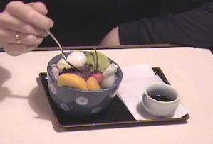 食,如 小 籠 飽 般 的 煎 餃 子,及 一 碗 紅 豆 雜 果